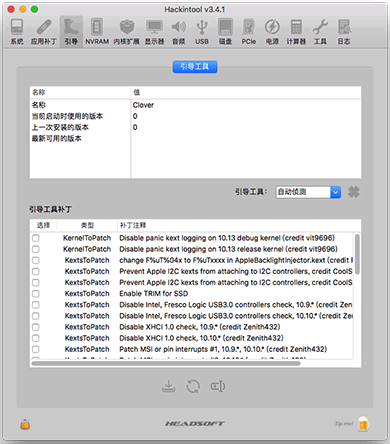 可修改项:系统、应用补丁、引导、NVRAM、内核扩展、显示器、音频、USB、磁盘、PCIE、电源等。